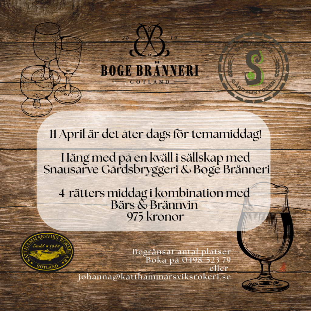 Häng med på en kväll i sällskap med Snausarve Gårdsbryggeri & Boge Bränneri! Ni får avnjuta en vårig 4-rätters middag i kombination med lokalt producerad Bärs & Brännvin tillsammans med producenterna själva.